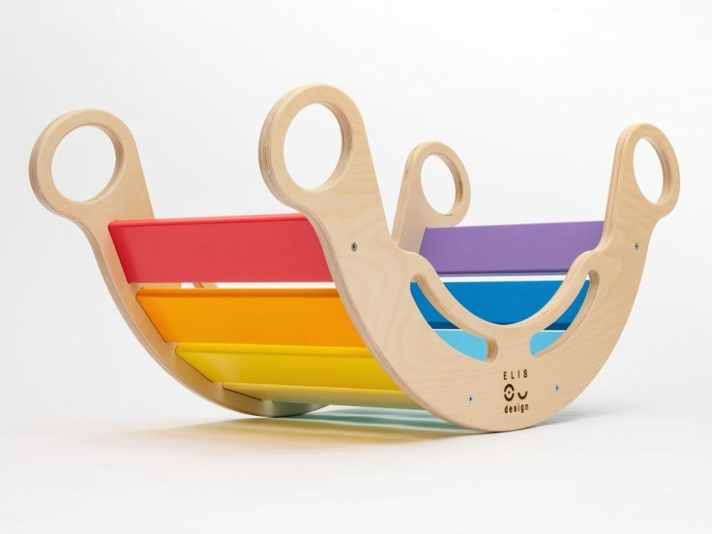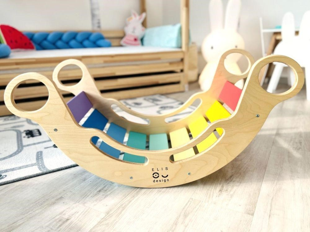 Velice kvalitní, bezpečná, hravá a vylepšená Montessori duhová houpačka 5in1 od ELIS DESIGN v úžasných svěžích, pestrých barvách, podpoří správný motorický rozvoj vašeho dítěte. Její všestranné využití umožní dětem používat houpačku nejen k houpání, ale i jako skluzavku, skrýš, prolézačku nebo sedačku. Houpačka (rainbow rocker) je vyrobena z těch nejkvalitnějších materiálů, ručně dohladka opracovaná a poctivě lakovaná barvami s atestem. Krásně barevná dřevěná houpačka je vhodná pro děti od 1 do 6 let..
