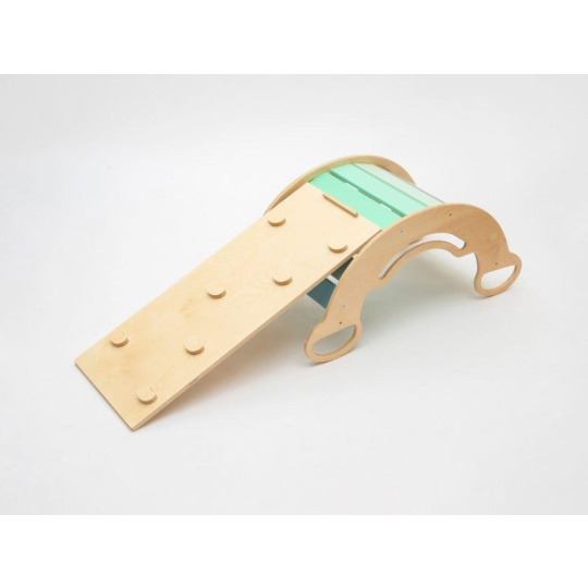 Dětská dřevěná Montessori houpačka smile 6in1, v příjemných pastelových barvách v modro-zelných tónech v kombinaci s neutrální šedou, vás překvapí svým designem i multifunkčností. Houpačka bude každý den svým širokým úsměvem lákat děti k příjemnému pohoupání i k zábavné hře. Její využití je všestranné, může být houpačkou, skluzavkou, prolézačkou, skrýší i sedačkou, při doplnění oboustranným prknem i dětským nábytkem. Oboustranné prkno není součástí houpačky. Vyrobená je z těch nejkvalitnějších materiálů, ručně dohladka opracovaná a lakovaná barvami s atestem. Montessori houpačka smile je širší než naše Montessori houpačky 5in1, proto k této houpačce nabízíme i speciální oboustranné prkno, které je doplňkem k houpačkám smile. Díky prknu snadno proměníte houpačku smile v dětský stoleček. Oboustranné prkno není součástí houpačky, pro využití houpačky jako nábytku je nutné prkno samostatně dokoupit..