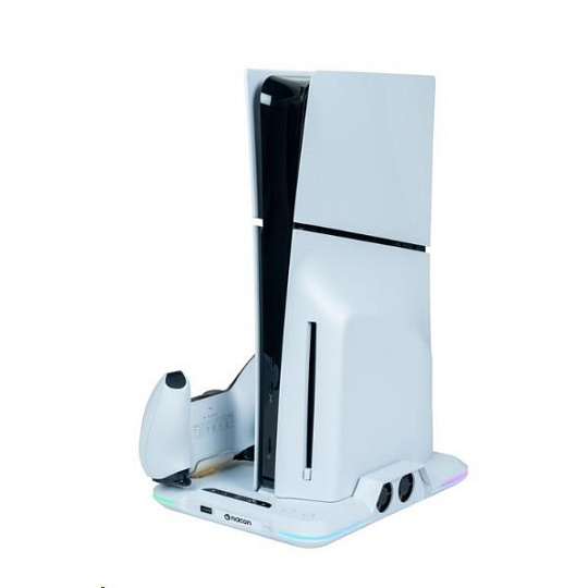 Umístěte svou herní konzoli PlayStation 5 Slim na tento víceúčelový vertikální podstavec od společnosti Nacon. Ten je kompatibilní s diskovou i digitální verzí této konzole a kromě dvou větráčků a jednoho portu USB-A na něm najdete také dvě kolébky sloužící k nabíjení herních ovladačů DualSense, přičemž o stavu jejich nabíjení vás informuje barevné podsvícení pod jednotlivými ovladači.
