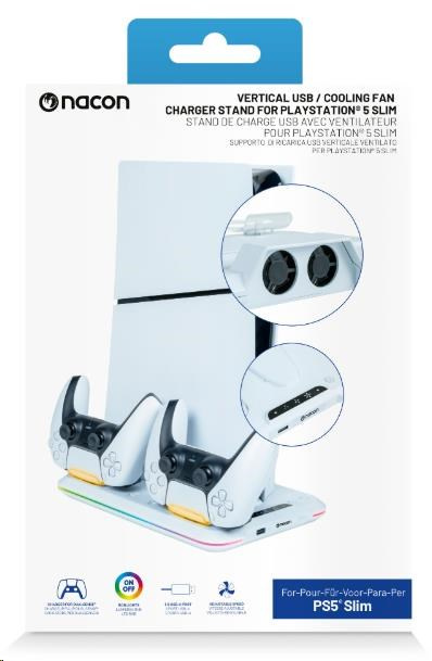 Umístěte svou herní konzoli PlayStation 5 Slim na tento víceúčelový vertikální podstavec od společnosti Nacon. Ten je kompatibilní s diskovou i digitální verzí této konzole a kromě dvou větráčků a jednoho portu USB-A na něm najdete také dvě kolébky sloužící k nabíjení herních ovladačů DualSense, přičemž o stavu jejich nabíjení vás informuje barevné podsvícení pod jednotlivými ovladači.
