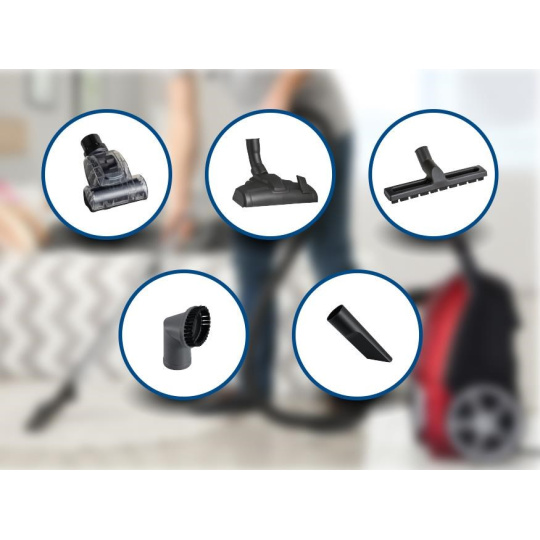 Extra tichý a výkonný sáčkový vysavač. Energeticky úsporný ECO motor. Hlučnost při plném výkonu jen 68 dB (A). Elektronická regulace výkonu. Kovové teleskopické trubky. Indikátor naplnění sáčku. Akční rádius 9 m (délka přívodního kabelu 6 m). Automatický naviják přívodního kabelu. Příslušenství: vysávací podlahová, spárová, kulatá kartáčová, parketová a turbo podlahová hubice. Jednoduché ovládání a snadná údržba. Napájení: 230V ~ 50 Hz, 600 W.