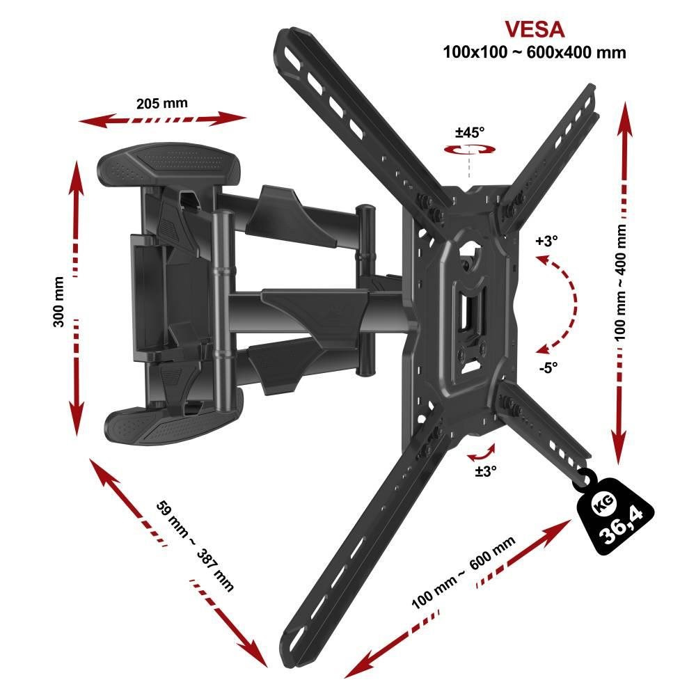 Profesionální nástěnný otočný sklopný držák na televize NB NBP5 Držák na Tv 32-70", VESA 100*100 až 600*400, nosnost 36,4kg, otočný +/-45°, sklopný +3°/-5°, výsuvný od 59 do 387mm, korekce roviny, úchyty na kabely, certifikovaný držák TUV ISO9001 Celoocelový držák pro naprosto spolehlivé a bezpečné uchycení televizorů 32-70" na stěny. Držák Vám umožní snadnou manipulaci s televizorem - otáčení do stran, naklápění, vysouvání a zasouvání, úprava roviny. Ramena držáku jsou osazena úchytkami na kabely, nástěnný úchyt je osazen designovými kryty. Držák podporuje VESA standardy Tv 100x100 až 400x400 a zavěsit můžete i televize s hmotností 36kg. Velmi kvalitní nástěnný držák na televize, otočný sklopný a výsuvný NBP5 Technické údaje: nosnost 36,4kg na televize 32" až 70" podporuje VESA standardy pro uchycení Tv 100x100 až 600x400 snadná manipulace s televizorem otáčení do stran +/-45° naklápění +3°/-5° vysouvání a zasouvání ke zdi od 59mm až do 387mm úprava roviny televize +/-3° úchytky na kabely designový kryt nástěnného úchytu extrémní pevnost a naprostá spolehlivost, vynikající kvalita celoocelové provedení instalační materiál součástí balení (hmoždinky, vruty, sada šroubů a podložek) certifikovaný držák TUV, ISO9001 barva černá záruka 5 let Špičkový držák na televizi se snadným polohováním televize NBP5 Tv držák NBP5 podporuje VESA standardy pro zavěšení televizorů: VESA 100*100 VESA 200*100 a 100*200 VESA 200*200 VESA 300*200 a 200*300 VESA 300*300 VESA 400*200 a 200*400 VESA 400*300 a 300*400 VESA 400*400 VESA 600*400 Držák na televizi NB NBP5 Balení obsahuje sadu instalačního materiálu: 4ks šroubů M4, M5 a M6 s délkou 25mm 4ks šroubů M8 s délkou 30mm 4ks podložek a 4ks distančních válečků 1ks klíč 10mm 4ks vrutů do hmoždinek 7x70mm 4ks hmoždinek (do cihly nebo betonu) Pokud z výše uvedené šrouby z balení nebudou pro uchycení Vaší televize vhodné, je nutné abyste si šrouby v potřebné délce a průměru zakoupili sami - bohužel výrobci Tv používají různé průměry a délky..