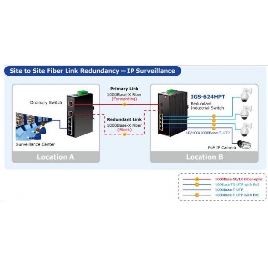 Planet IGS-624HPT, PoE switch 4x 1000Base-T, 2x SFP 100/1000Base-X, 802.3at 120W, DIN,IP30, -40 až +75st.C Přepínače pro průmyslový Ethernet jsou určeny do náročných provozních podmínek s velkým rozsahem pracovních teplot, nejistým napájením a častými otřesy. Verze přepínačů řady s rozšířeným teplotním rozsahem. Přepínače řady IGS se snadno instalují na standardní DIN lištu nebo přímo na zeď a umožňují nasazení dobře známé Ethernetové technologie i v průmyslovém prostředí. Stejně tak jsou vhodné pro instalace do venkovně umístěných skříní s velkým kolísáním pracovních teplot (typicky bezdrátové a MAN ISP aplikace). Jako PoE přepínač umožňuje přímo napájet až 4 koncová zařízení dle normy IEEE 802.3at, je tak ideálním prvkem pro aplikace se sníženou možností napajení. Vlastnosti: - 4x 1000Base-T, Switching, Full Duplex (1000/2000 Mbps), Auto-Negotiation (10/100/1000 Mbps), automatická detekce přímý/křížený kabel na každém portu - na všechny metalické porty implementace PoE IEEE 802.3at injektory se zatížitelností 30W/port, celkově až 120W - 2x SFP 100-FX / 1000Base-X pro instalaci mini-GBIC modulů, sdílené porty s 5 a 6 TP portem - propustnost: sběrnice 12Gbps, provozně 8.93Mp/s(64Bajtů) - 1k MAC adres, MTU max. 9216Bajtů - DIP přepínače pro nastavení práce portů, LED indikátory stavu provozu - instalace na DIN lištu, montážní díl součástí - instalace na zeď, montážní díl součástí - krytí IP30 - napájení: 48V DC redundantní, připojení možné ze dvou různých zdrojů (nejsou součástí balení); vlastní příkon do 15W - ochrana proti přepólování, připojení napájení na svorkovnici, umístění na spodním panelu (nepřekáží při montáži na zeď) - přepěťová ochrana napájení do 6kV proti napěťovým špičkám (EFT) - přepěťová ochrana LAN portů proti elektrostatickému náboji do 6kV (ESD) - zařízení je odolné proti pádu (IEC-60068-2-32) z výšky 75cm na všechny dopadové části - zařízení je odolné proti vibracím (IEC-60068-2-6) 10-500-10Hz, 4x g, 0,5oct/min - zařízení je odolné proti přetížení krátkodobému zrychlení 50g, dlouhodobému 4g, (IEC-60068-2-27) - EMI/EMS, elektromagnetická kompatibilita a slučitelnost dle CE EN-6100-4-2,3,4,5,6 - elektrická bezpečnost dle CE EN-60950 - pracovní teplota -40 až 75°C, vlhkost do 95% - rozměry: 152 x 107 x 32 mm - hmotnost: 1539g.