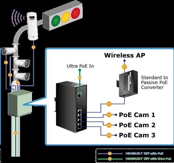 Průmyslový Power over Ethernet extender IEEE 802.3at se 4-portovým gigabitovým přepínačem a injektory pro další napájení zařízení po ethernetu. Injektory lze zatížit do 60W v kombinaci 2x 802.3at zařízení po 30W nebo 4x 802.3af zařízení po 12W. Designovaný pro použití s kamerami PTZ, dotykovými monitory, VoIP aparáty nebo WiFi přístupovými body v terénu a na težko dostupných místech. Provoz extenderu je možný při teplotách od -40 do 75°C, je odolný vůči vibracím, přetížení a externím mechanickým vlivům; všechny porty obsahují ESD+EFT ochranu proti přepětí a elektrostatice. Extender se napájí přímo pomocí PoE UltraPower injektorem (60W) Planet POE-171 nebo POE-173! Parametry: - Ethernet rozhraní: 1x napájecí PoE vstup (Ultra Power 60W); 4x injektory - celková zatížitelnost inejktorů 60W (2x 30W nebo 4x 12W) - slučitelné s IEEE 802.3u, IEEE 802.3ab 1000Base-T, IEEE 802.3af, IEEE 802.3at - instalace na DIN lištu nebo na zeď, montážní díl součástí - krytí IP30, skříň celohliníková - zařízení je odolné proti pádu (IEC-60068-2-32) z výšky 75cm na všechny dopadové části - zařízení je odolné proti vibracím (IEC-60068-2-6) 10-500-10Hz, 4x g, 0,5oct/min - zařízení je odolné proti přetížení krátkodobému zrychlení 50x g, dlouhodobému 4x g (IEC-60068-2-27) - integrována ochrana EFT/ESD proti zavlečení cizího napětí a proti rychlým přechodovým jevům do 6KV DC - EMI/EMS, elektromagnetická kompatibilita a slučitelnost dle CE EN-6100-4-2,3,4,5,6 - elektrická bezpečnost dle CE EN-60950 - LED indikace zatížení - pracovní teplota -40 až 75°C, vlhkost do 95% - rozměry: 135 x 87.8 x 56 mm - hmotnost 715g - napájení PoE IEEE 802.3at, 60W UltraPower injektorem (Planet POE-171 nebo POE-173).