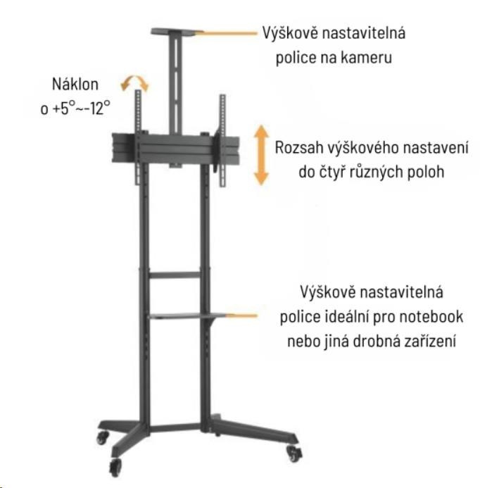 Všestranný pojízdný stojan Brateck T1040T je určen pro instalaci TV s plochou obrazovkou s úhlopříčkami od 37“ do 70“ a hmotností až 50 kg. Stojan poskytuje stabilní podporu a díky integrovaným kolečkům s možností aretace zároveň umožňuje snadné a bezpečné přemístění dle potřeby. Montážní deska pro upevnění TV je nastavitelná ve čtyřech různých výškových úrovních, jednoduchá změna náklonu TV v rozsahu +5°~-12° pak umožňuje nastavení optimálního pozorovacího úhlu. Stojan je navíc vybaven jednou výškově stavitelnou poličkou na kameru s nosností 5 kg a jednou výškově nastavitelnou poličkou na příslušenství s nosností 5 kg. Díky tomuto příslušenství je stojan vhodný pro pořádání telekonferencí, ale také pro využití při kancelářských a školních prezentacích, nebo při domácí zábavě.