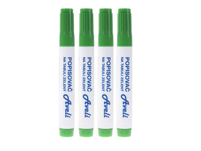 Popisovače na tabule a flipcharty AVELI. Sada 4 zelených popisovačů. Netoxický Šíře stopy 3 mm Kuželový hrot Snadno stíratelný Odolný proti vyschnutí.