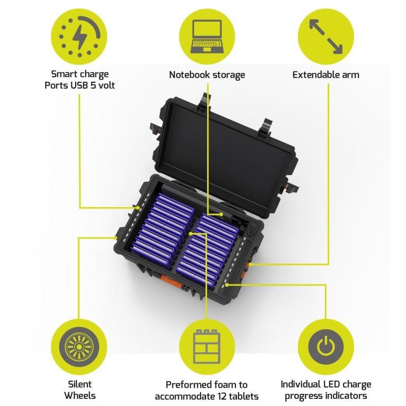 Nejefektivnější řešení pro nabíjení 20 tabletů a 1 notebooku během přepravy