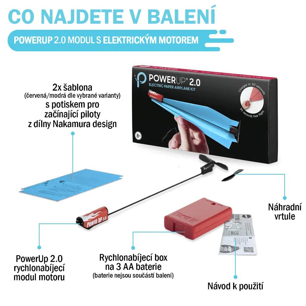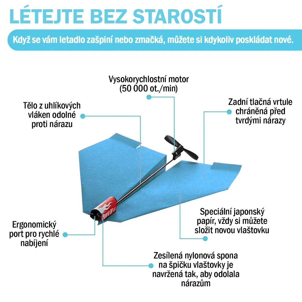 Skládání papírových vlaštovek baví každou generaci. Sada PowerUp 2.0 RED vybaví obyčejné vlaštovky vlastním elektrickým pohonem, díky kterému zůstane ve vzduchu déle než půl minuty a uletí desítky metrů.