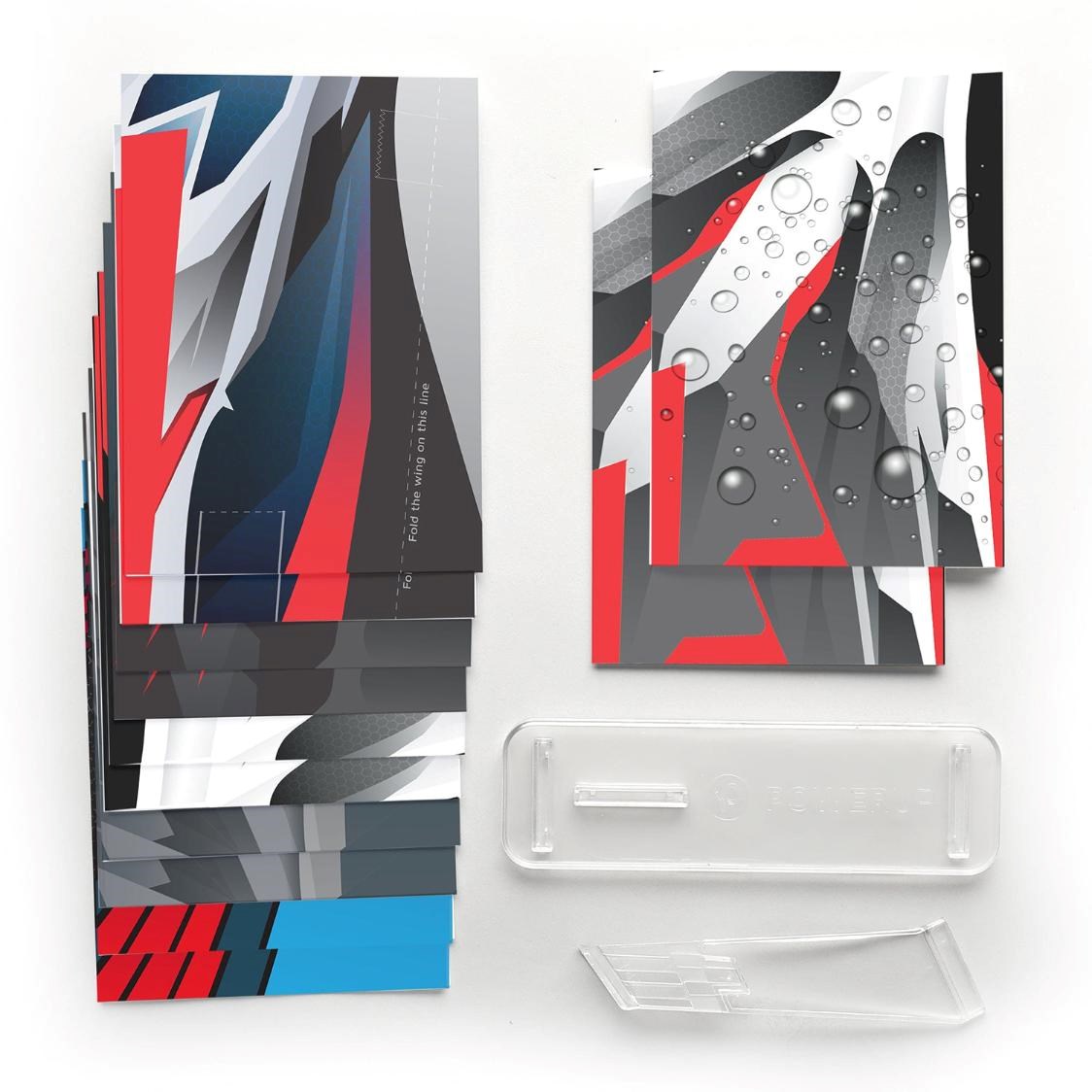 Krabice ukrývá přesně 12 kusů šablon připravených k okamžitému složení. Deset z nich tvoří prémiový japonský papír rozdělený do 6 různých motivů. Zbylé dva archy zastupují speciální voděodolný materiál Tyvek®. Součástí setu je navíc praktický stolní stojánek. Ten perfektně poslouží ve chvílích, kdy zrovna nelétáte, a umožní vám obdivovat ten nejpovedenější kousek přímo na pracovním stole.