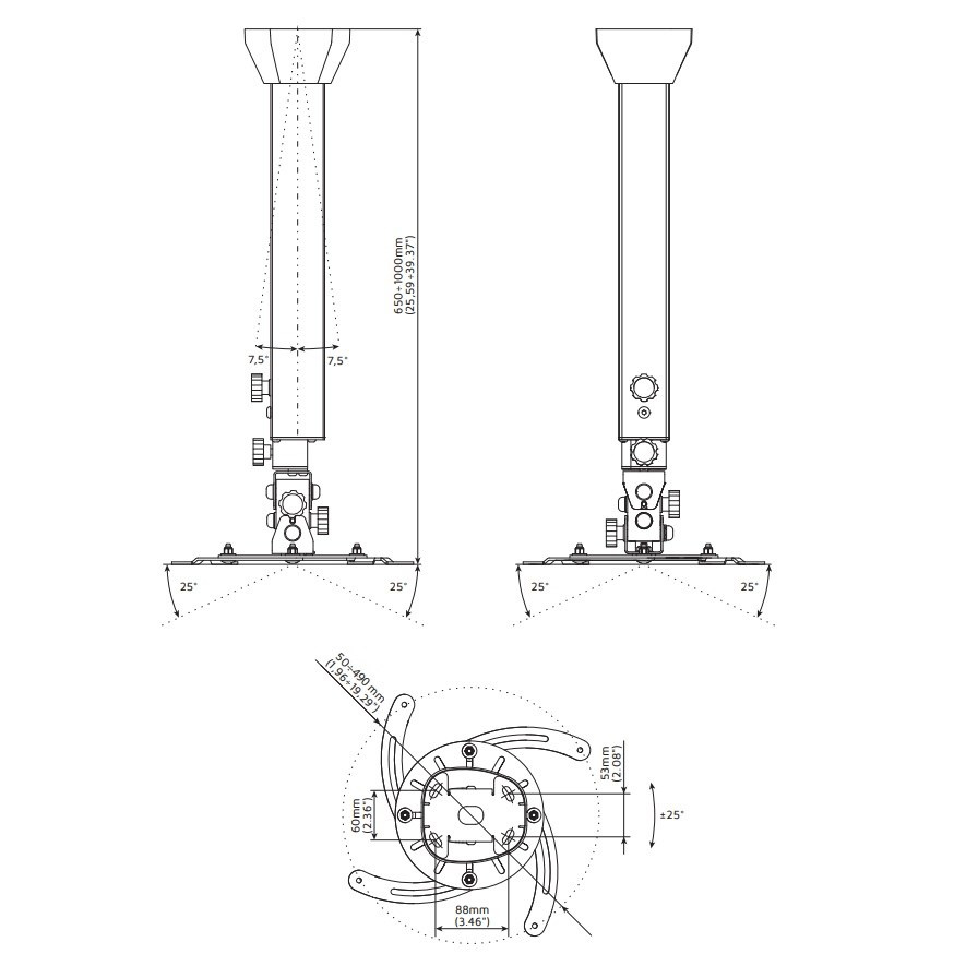 Profesionální designový stropní držák na projektor EDBAK PMV200 Stropní držák pro zavěšení projektoru s hmotností do 15kg, nejvyšší kvalita, design, nastavitelnost 65-100cm Ne vždy je možné použít obyčejný stropní držák na projektory, někdy je nutné použít držáky nejvyšší kvality a krásného designu. My Vám takové držáky na projektory nabízíme. Ucelená řada profesionálních stropních držáků na projektory v nadherném designovém provedení. Držáky jsou plně nastavitelné, vhodné pro 99% dostupných projektorů a dataprojektorů. Barevné provedení černé nebo bílé. Záruka 5 let. Pokud Vám záleží na designu stejně jako na kvalitě, jste na správné stránce. Držáky na projektory nejvyšší kvality, různé délkové nastavení, otáčení, naklápění, vedení kabeláže Edbak PMV200 Technické údaje: nosnost 15kg univerzální držák pro uchycení 99% dostupných projektorů na projektory se 3 nebo 4 otvory pro uchycení rozteč otvorů pro uchycení v rozmezí 50-490mm délkové nastavení 650mm až 1000mm otáčení do stran +/- 360° náklon do stran +/- 25° náklon nahoru a dole +/- 25° korekce roviny obrazu korekce nerovnosti stropu +/- 7,5° zajištění v požadované pozici systém pro skryté vedení kabeláže nejvyšší kvalita - profesionální provedení nádherný design bílé nebo černé provedení záruka 5 let Edbak PMV200 Na stropní držák s nastavením délky 65-100cm EDBAK PMV200 je možné uchytit všechny projektory, které mají 3 nebo 4 otvory se závitem s roztečí 50mm až 490mm. Díky nejvyšší kvalitě a profesionálnímu provedení jsou držáky EDBAK řady PMV vhodné opravdu kamkoliv..