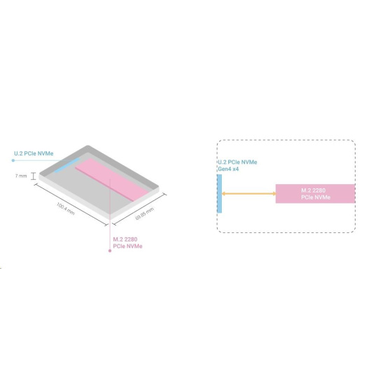 Lehký QDA-UMP4A umožňuje nainstalovat M.2 PCIe NVMe SSD do 2,5” slotu pro U.2 (SFF-8639) PCIe NVMe SSD zařízení QNAP NAS. (M.2 SSD se prodává samostatně)