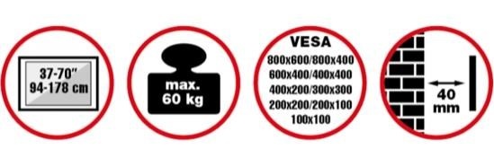 Cenově výhodný nástěnný ocelový držák SLIM s minimální vzdáleností od stěny na Plasma a LCD TV s uhlopříčkou 37"- 70" (94-178cm) a hmotností maximálně 60kg. Bez konzole (pouze úchyty) na zavěšení TV s upevněnými držáky - protikusy, dolní distanční prvky. Není vertikálně výklopný, vzdálenost od stěny 40mm, materiál ocel, barva černá. Uchycení VESA: 100x100, 100x200, 200x200, 400x200, 400x400, 600x400, 600x600, 800x600..