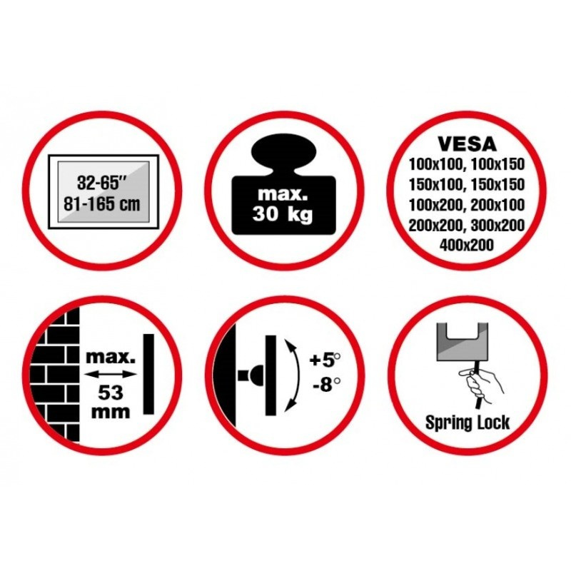 Nástěnný ocelový držák na OLED TV s uhlopříčkou 32"- 65" (81-165cm) a hmotností maximálně 30kg. Konzole na zavěšení TV s vodováhou, vertikálně výklopný +5°/-8°, vzdálenost od stěny 53mm, materiál hliník/ocel, zámek Spring Lock se šňůrou, měkká podložka, barva černá. Uchycení VESA: 100x100, 100x150, 150x150, 200x100, 200x200, 300x200, 400x200..