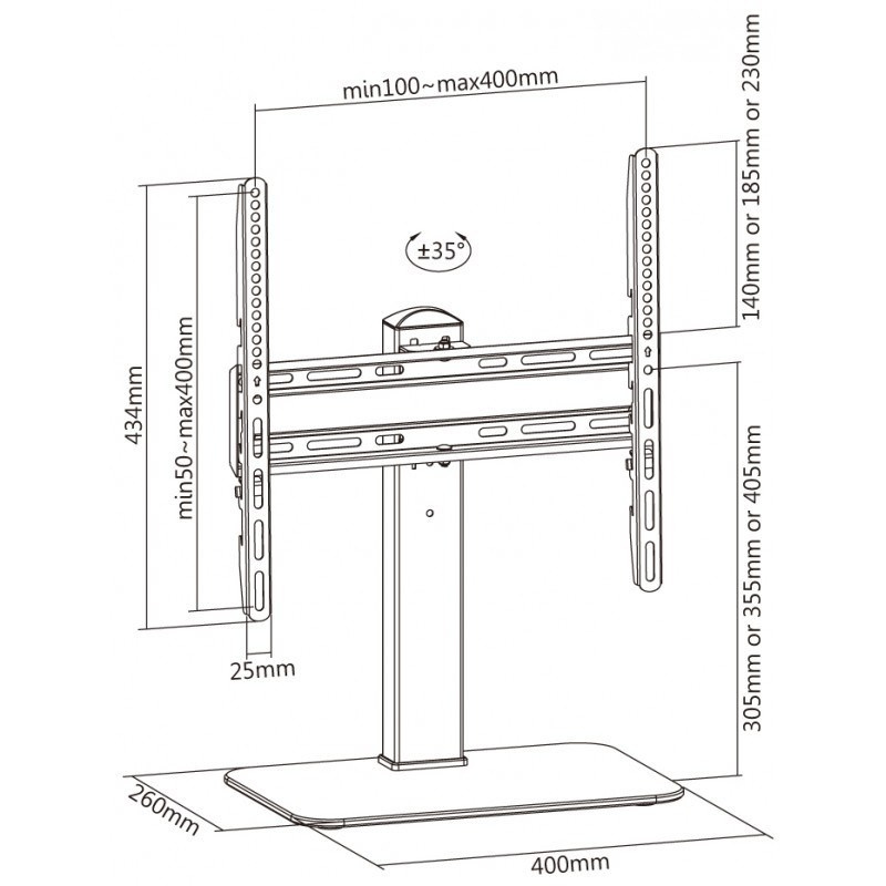 Televizní stojan na nábytek pro velké TV s uhlopříčkou 32"- 55" (81-140cm) a hmotností maximálně 40kg. Středový nosný profil na skleněné ploše, výška včetně TV 142,5-152,5cm, držák vertikálně výklopný +0°/-35° a otočný +35°/-35°, rozměry 43x28x67cm, materiál sklo/ocel, barva černá. Uchycení VESA: 100x200, 200x100, 200x200, 300x200, 300x300, 400x200, 400x400..