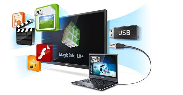 MagicInfo Lite je sofistikovaná technologie, která umožňuje lokální nebo vzdálnou správu multimediálního obsahu jako jsou videa nebo obrázky, které můžete podle potřeby různě kombinovat a plánovat jejich zobrazení v požadovaném čase. Toto řešení umožňuje používat velkoformátový displej jako samostatnou jednotku bez nutnosti použití externího přehrávače. Obsah je možné přehrávat z interní paměti monitoru, externího USB nebo vzdáleně prostřednicvím vzdáleného serveru.