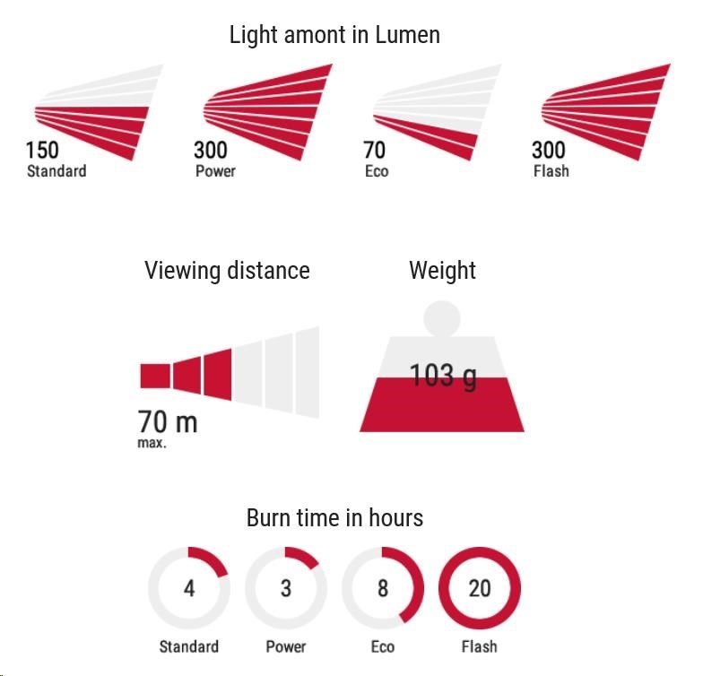 Se čtyřmi různými režimy může být intenzita osvětlení optimálně přizpůsobena. Světlo má 3 režimy svícení: intenzivní 300 lm / standardní 150 lm / ekonomický 70 lm a režim blikání.