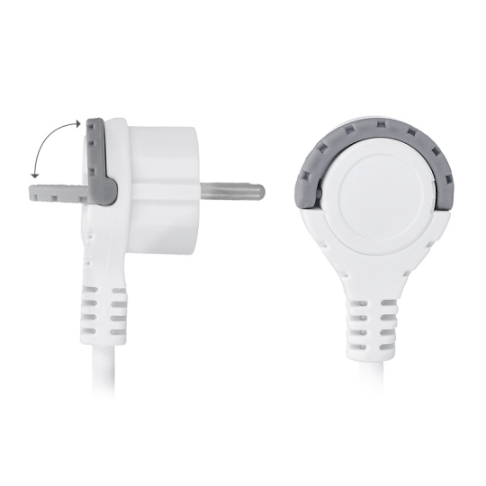 • úhlová vidlice s nízkým profilem od stěny, sklopný úchyt pro snadné vytažení ze zásuvky