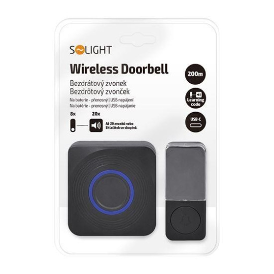 Solight bezdrátový zvonek, bateriový + USB, 200m, černý, learning code