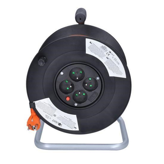 PVC kabel s vodiči o průřezu 3×1,5 mm2 je vhodný pro vnitřní a suché chráněné prostory. Buben je vybaven čtyřmi zásuvkami s dětskými pojistkami, navíc i tepelnou pojistkou, která přeruší napájení v případě přetížení nebo při použití bez úplného odvinutí kabelu. Barevné odlišení kabelu od okolního prostředí zvyšuje bezpečnost při práci.