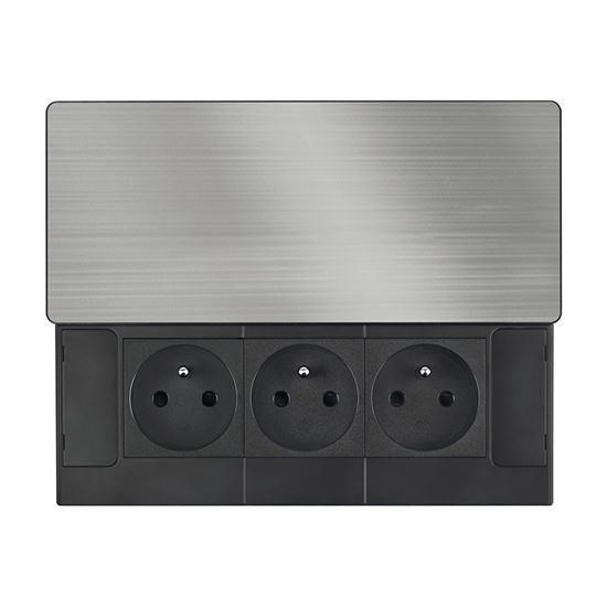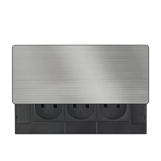 Vrchní kryt z matné tmavé nerez oceli (inox) působí elegantně a snadno se začlení do jakéhokoliv moderního interiéru. Nízký profil a posuvné otevírání šetří místo a nenarušují vzhled pracovní plochy. Ovládání je jednoduché, kryt stačí posunout a zásuvky jsou ihned k dispozici.
