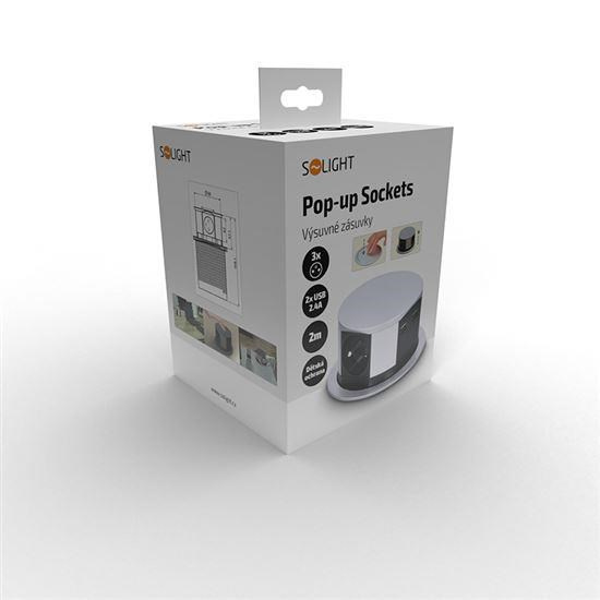 Solight výsuvný blok zásuvek, 3 zásuvky, 2x USB, kruhový tvar nízký, prodlužovací přívod 1,5m, 3 x 1mm2, stříbrný