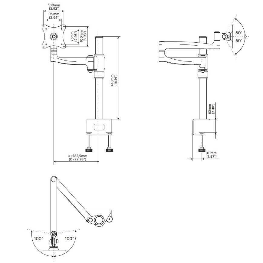 Profesionální stolní držák na monitor Edbak DM101 Profesionální stolní držák na monitory 17-27", výsuvný 0-700mm , otočný +/-360°, sklopný +/-60°, výškové polohování 100-400mm , pivot +/-360°, VESA 75x75 a 100x100, nosnost 10kg Designový profesionální kancelářský držák na monitor - nejvyšší kvalita a krásný moderní design. 3D polohování - otáčení do stran, výškové polohování, naklápění, funkce pivot, nastavení vzdálenosti od stolního uchycení, systém vedení kabeláže. VESA 75x75 a 100x100, nosnost 10kg. Systém na vedení kabeláže, barva černá, záruka 5 let. Profesionální kancelářský stolní držák na monitor Edbak DM101 Technické údaje: nosnost 10kg podpora VESA standardů 75x75 a 100x100 doporučená úhlopříčka monitoru 17" až 27" otáčení do stran +/-360° nastavení vzdálenosti od stolního uchycení max. 700mm velký rozsah naklápění +/-60° nastavení výšky 100-400mm funkce pivot +/- 360°- obrazovku je možné přetočit na šířku nebo na výšku systém pro vedení kabeláže 2 typy stolních úchytů (svěrák max. 120mm, průchodka max. 55mm) nejvyšší kvalita, krásný design barevné provedení černé záruka 5 let detail držáku monitoru Edbak DM101Skryté vedení kabeláže držáku monitorů Edbak DM101 Stolní kancelářský držák Edbak DM101 podporuje VESA standardy: VESA 75x75 VESA 100x100 možnost zakoupení rozšíření VESA 200x100 možnost zakoupení rozšíření VESA 200x200.