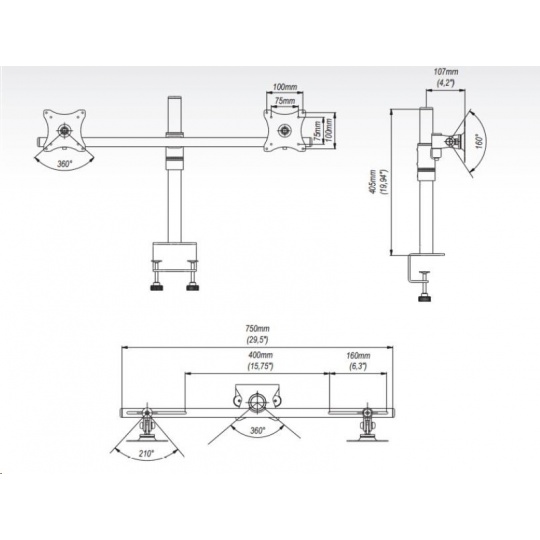 Technické údaje:  max. zatížení 20kg na monitory a tv o úhlopříčce 17" až 27" VESA standart 75x75 a 100x100 nezávislé nastavení každé obrazovky náklon nahoru i dole +/- 60° otáčení do stran +/- 90° posun obrazovky v ose držáku - nastavení vzdálenosti mezi monitory výška držáku 405mm nastavení požadované výšky dle potřeby volba typu uchycení dle vaší potřeby volitelná barva - černá nebo stříbrná záruka 5 let.