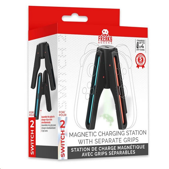 Tato kompaktní nabíjecí stanice značky Freaks & Geeks přichází s originálním řešením pro nabíjení herních ovladačů Joy-Con 2, které majitelé herní konzole Nintendo Switch 2 nepochybně ocení. Stanice umožňuje nabíjet současně až čtyři ovladače, protože je ale tvořená dvěma samostatnými držáky, které lze od sebe oddělit, je s pomocí přiloženého dvoumetrového USB kabelu možné nabíjet dva ovladače i během hraní. Sami si tak můžete zvolit režim nabíjení, který právě vyhovuje vašim potřebám. Magnetické připojení ovladačů Joy-Con 2 k držákům se postará o jejich stabilní a efektivní nabíjení za jakékoliv situace a každý držák rovněž disponuje vlastními ukazateli stavu nabíjení připojených ovladačů. Složená stanice pod sebe navíc promítá zelené logo Freaks & Geeks, což ještě umocňuje její neotřelé provedení.