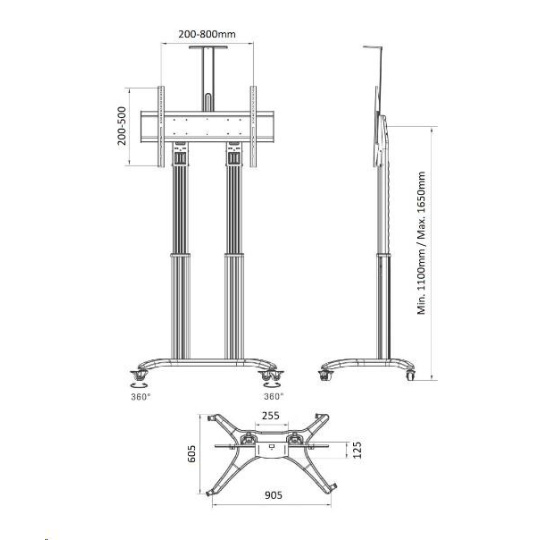 Televizní stojan na videokonference NB AVF1800B Profesionální stojan na televize a monitory 50-90", ideální na videokonference nebo prezentace, výškové nastavení 110-165cm, polička na kameru, pojízdný, nosnost 56,8kg Televizní stojan ideální na videokonference nebo prezentace - vhodný pro zavěšení televizorů nebo monitorů s úhlopříčkou 50-90" a nastavení do požadované výšky od 110cm do 165cm (výška po střed obrazovky). Pro umístění kamery je na stojanu polohovatelná polička s rozměry 255x125mm a nosností 4,5kg. Stojan vyniká kvalitou, designem a snadným nastavením. Veškerou kabeláž je možné vést skrytě tělem stojanu. Vyroben je z hliníku, kolečka jsou osazena brzdou. Barevné provedení černé, záruka 5 let. Televizní stojan na videokonference NB AVF1800B Technické údaje: nosnost 56,8kg na televize a monitory 50-90" podporuje VESA standardy 200x100 až 800x400 plynulé nastavení rozsahu výšky 1100 - 1650mm (výška od podlahy po střed obrazovky) horní polička na kameru 255x125mm, nosnost 4,5kg systém pro skryté vedení kabeláže hliníková konstrukce i podstava profesionální pojezdová kolečka, všechny jsou osazeny brzdou nejvyšší kvalita, snadné nastavení, maximální bezpečnost barevné provedení černé záruka 5 let Stojan na videokonference, přednášky a propagace s nastavením výšky Tv 110-165cm NB AVF1800BStojan na televize a monitory NB AVF1800B je dodáván včetně horní poličky na kameru s nosností 4,5kg Tv stojany AVF1800B podporují VESA standardy: VESA 200x100 VESA 200x200 VESA 300x200 a 200x300 VESA 300x300 VESA 400x200 a 200x400 VESA 400x300 a 300x400 VESA 400x400 VESA 600x200 VESA 600x300 VESA 600x400 VESA 800x400 VESA 800x500 Stojany na Tv NB AVF1800B jsou ideální pro využití na videokonferencích, přednáškách nebo propagacích. Své uplatnění našli především ve firmách, školách, na výstavách ale i pro soukromé účely v domácnostech..