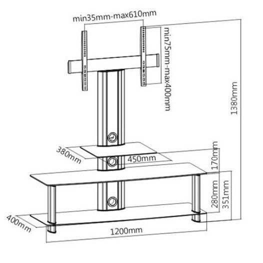 Televizní stolek s držákem Tv Fiber Mounts M6C26 Televizní stolek s držákem na Tv 37-60", 2 police 1200x400mm, horní polička 450x380mm, VESA 100x100 až 600x400, výška 1180mm, nosnost 40kg Stylový televizní stolek s držákem pro zavěšení televizorů s úhlopříčkou 37-60", výška Tv 1180mm, včetně 3 skleněných polic na příslušenství k Tv z tvrzeného bezpečnostního skla v černém lesklém provedení, rozměr 2 polic 1200x400mm, nosnost 15kg, rozměr vchní police 450x380mm, nosnost 5kg. Systém pro skryté vedení kabeláže, držák s podporou VESA 100x100 až 600x400 a nosností 40kg. Ideální do obývacích nebo dětských pokojů, ložnic, kanceláří a konferenčních místností. Kvalitní stylový televizní stolek Fiber Mounts M6C26 Technické údaje: nosnost 40kg podpora VESA standardu 100x100 až 600x400 na televize s úhlopříčkou 37-60" celková výška včetně držáku 1380mm výška po střed obrazovky 1180mm celková šířka 1200mm rozměr menší police: 450x380mm, nosnost 5kg rozměr dolních polic: 1200x400mm, nosnost 15kg systém pro skryté vedení kabeláže vynikající kvalita materiál: hliník + tvrzené bezpečnostní sklo instalační materiál záruka 2 roky Televizní stolek včetně držáku na televizi s úhlopříčkou 37-60 palců Fiber Mounts M6C26 Televizní stolek M6C26 s držákem Tv podporuje VESA standardy: VESA 100x100 VESA 200x100 a 100x200 VESA 200x200 VESA 300x100 a 100x300 VESA 300x200 a 200x300 VESA 300x300 VESA 400x200 a 200x400 VESA 400x300 a 300x400 VESA 400x400 VESA 500x300 VESA 600x400 Na televizní stolek Fiber Mounts F62M6 je možné zavěsit všechny typy (LCD, LED, OLED, plazma, 3D, Smart, Ultra HD) a značky (SONY, Panasonic, LG, Samsung, Orava, Hyundai, Philips, Hitachi, atd.) televizorů, které podporují kterýkoliv z výše uvedených VESA standardů..