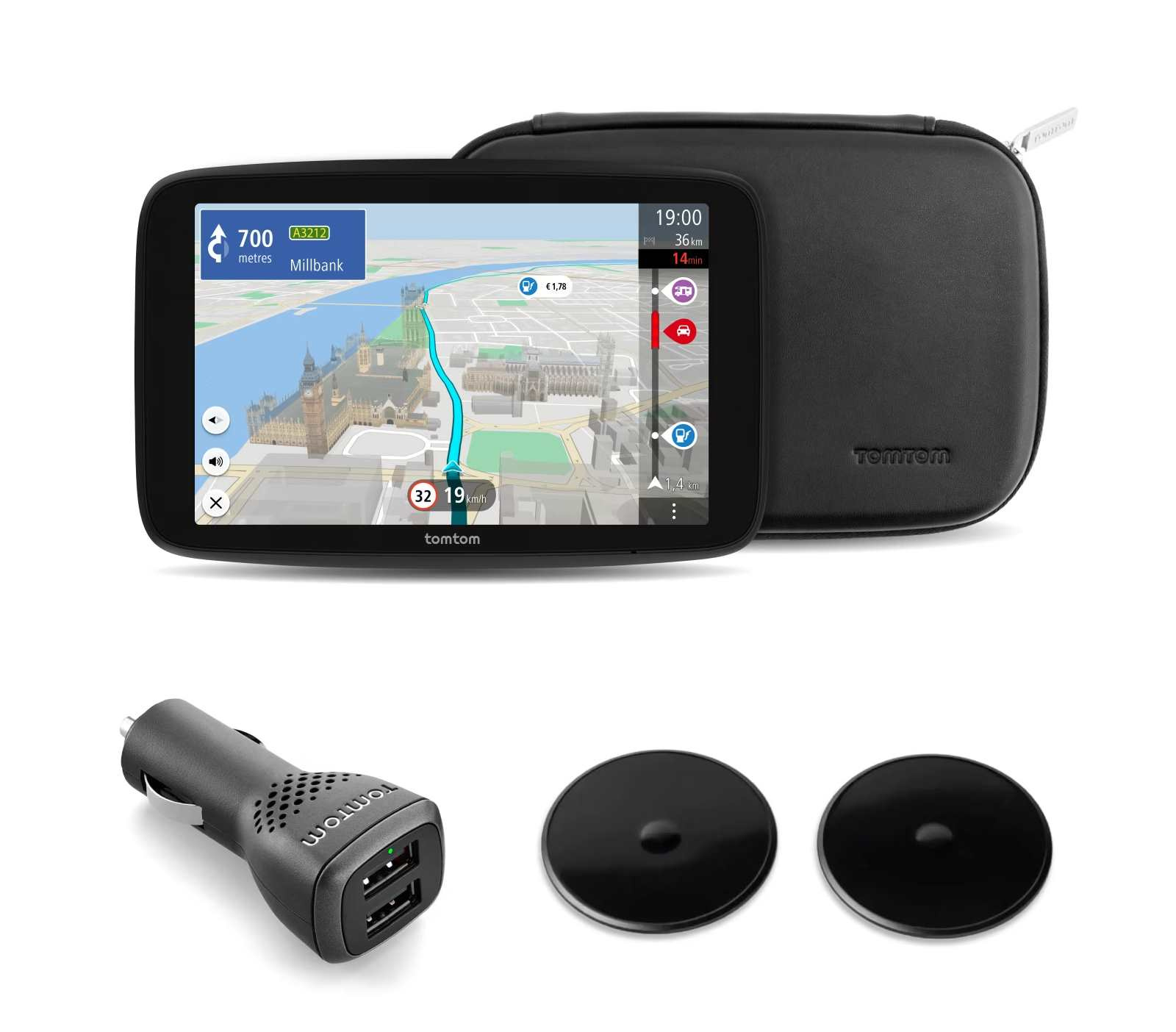 • Obsah balení: Click-and-drive držák, USB-C kabel, duální nabíječka do auta, přilnavé disky, kožené pouzdro, instalační leták