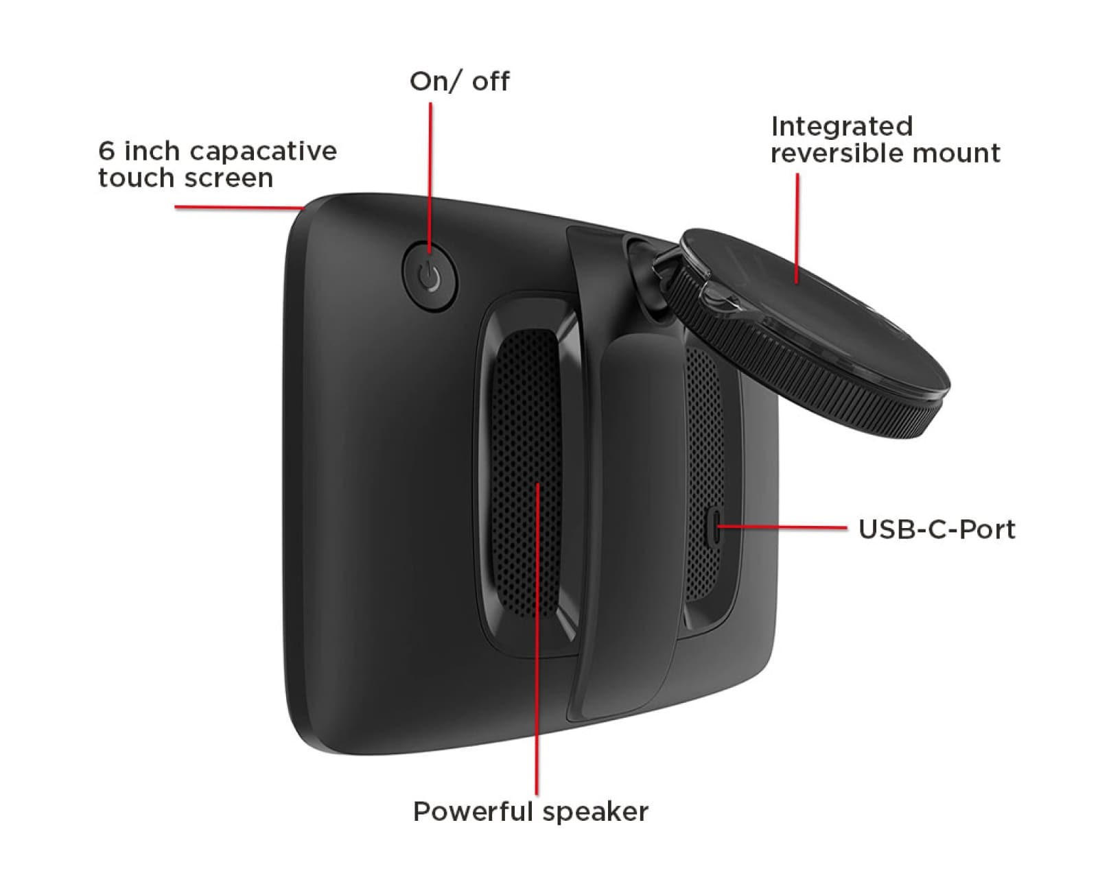 Sledujte svou trasu na 6" dotykové obrazovce s vysokým rozlišením pro bezpečnější jízdu a díky výkonnému reproduktoru snadno uslyšíte každý signál. Výkonný reproduktor zajistí zřetelné mluvené pokyny.