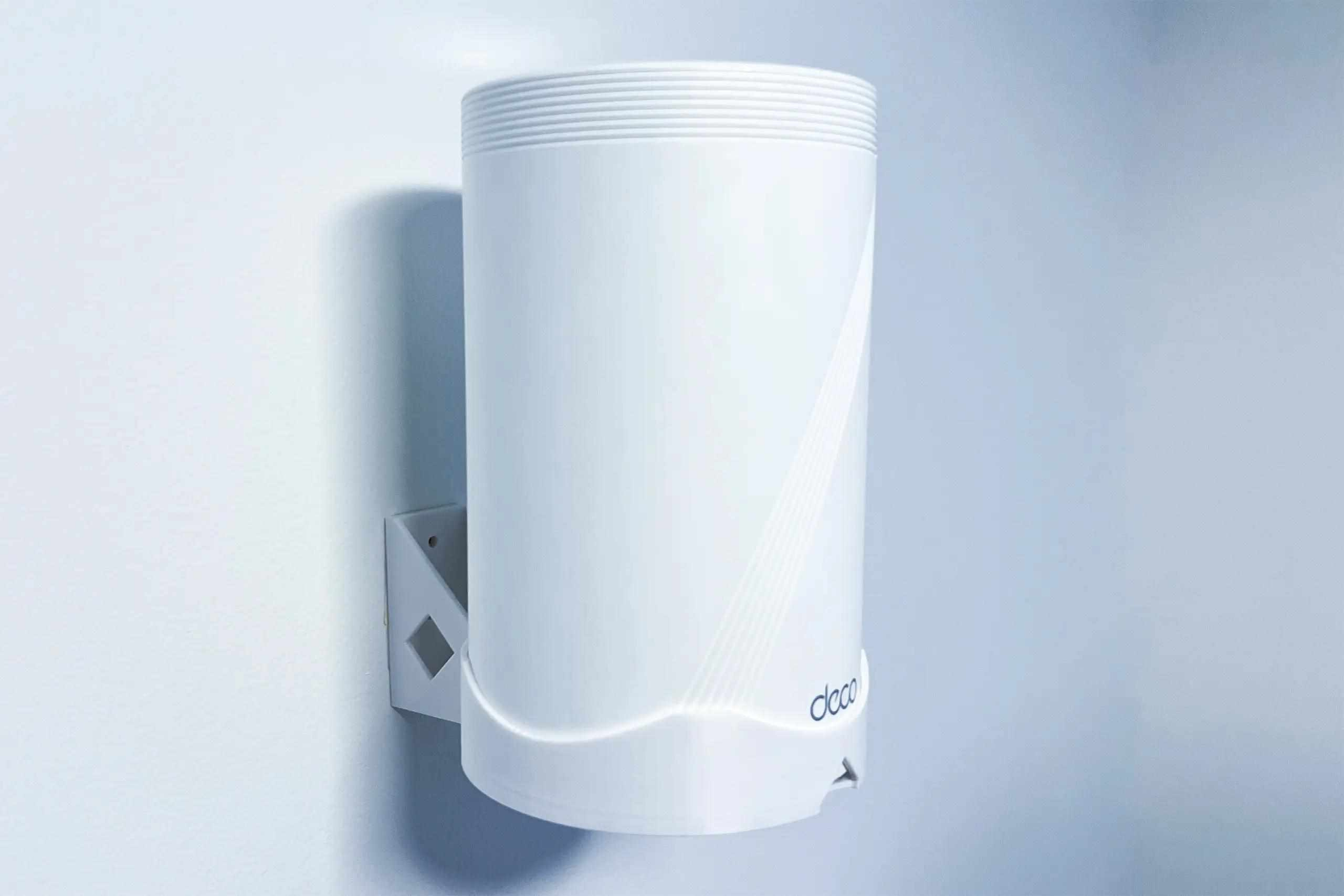 Plastový držák na stěnu pro TP-Link DECO BE65 na stěnu a to pomocí dvou šroubů. Držák je vyroben z PETG materiálu na 3D tiskárně a má bílou barvu.