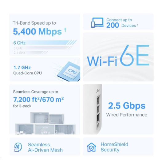 - Wi-Fi 6E pokrytí celé domácnosti – pokryjte plochu až 500 m2 ničím nerušeným Wi-Fi signálem příští generace a zapomeňte na mrtvé zóny pokrytí a načítání do vyrovnávací paměti