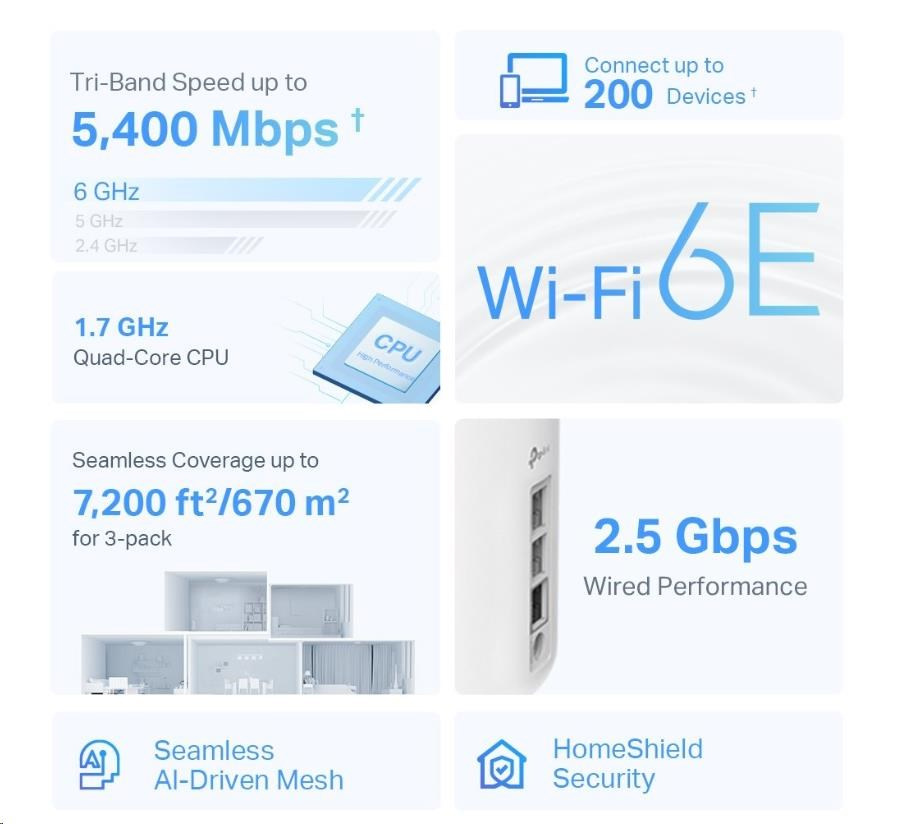 - Wi-Fi 6E pokrytí celé domácnosti – pokryjte plochu až 500 m2 ničím nerušeným Wi-Fi signálem příští generace a zapomeňte na mrtvé zóny pokrytí a načítání do vyrovnávací paměti