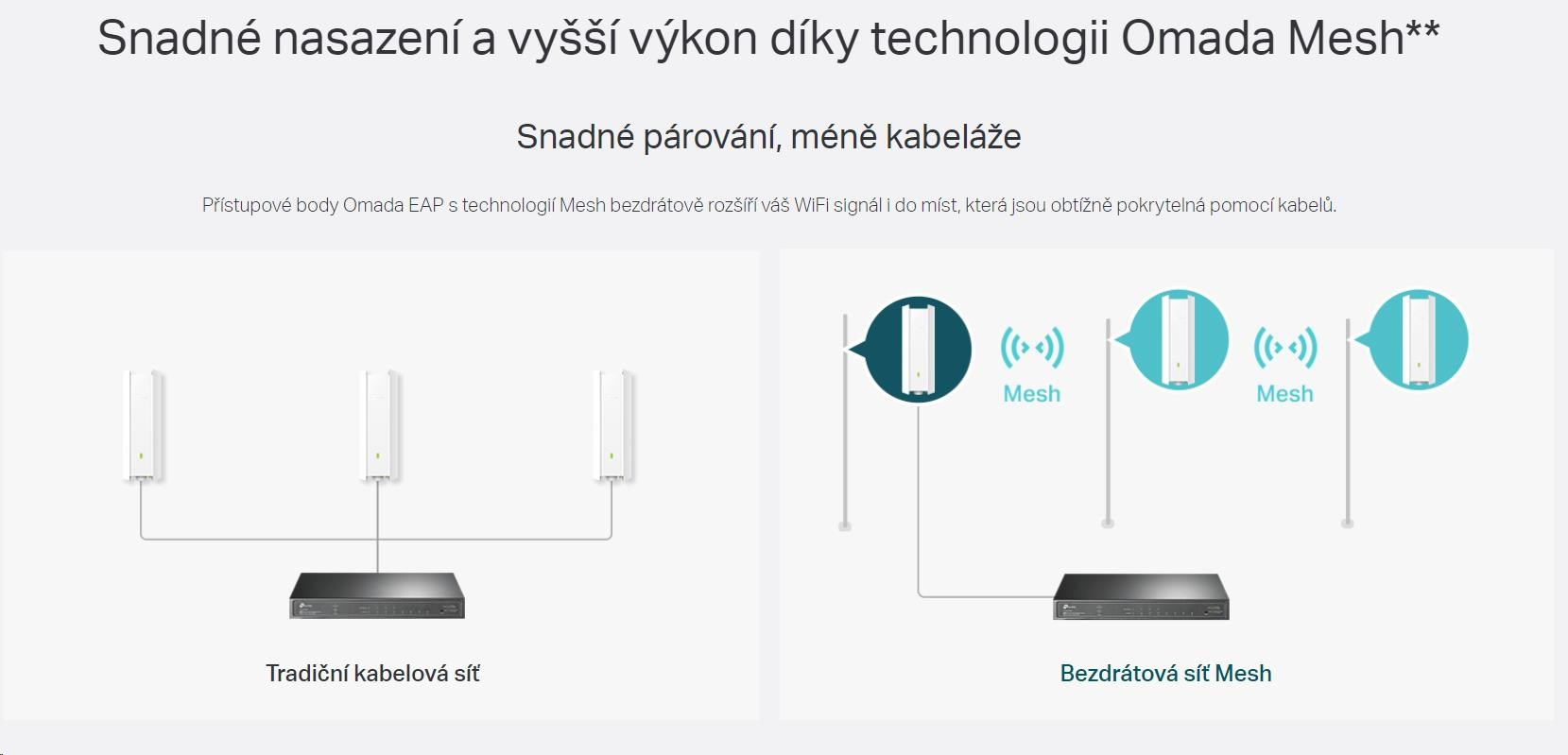 - Technologie Omada Mesh: Umožňuje bezdrátovou konektivitu mezi přístupovými body k získání prodlouženého dosahu a flexibilního nasazení.