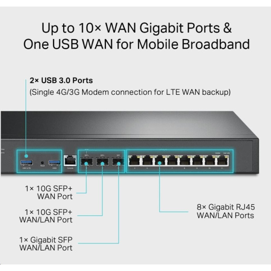 - Až 10 portů WAN - Porty Fiber a RJ45 WAN s vyvážením zátěže zvyšují míru využití vícelinkového širokopásmového připojení.