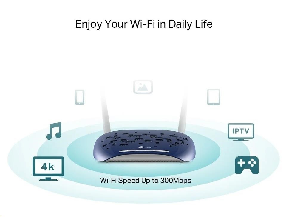 Modem/router TD-W9960 nabízí rychlost bezdrátového přenosu dat v pásmu 2,4 GHz až 300 Mb/s a navíc 4 megabitové síťové porty LAN – je tak dokonalou volbou pro streamování videí v HD rozlišení a jiné aplikace, které vyžadují vysoké přenosové rychlosti.