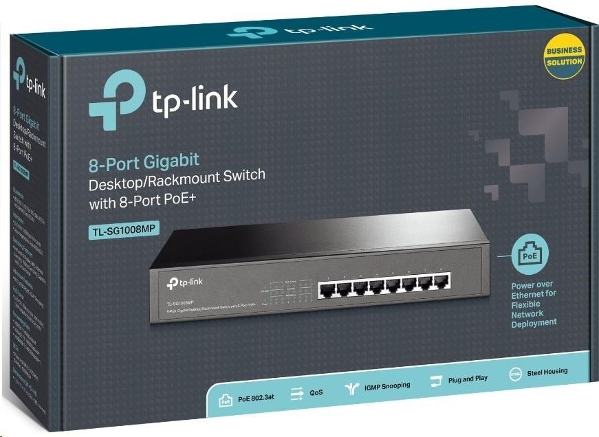 TL-SG1008MP je 8portový gigabitový stolní/rackový switch, přičemž všech 8 portů podporuje standard napájení PoE+. Zařízení představuje snadné řešení, jak rozšířit kabelovou síť, neboť umožňuje přenášet napájení i data pomocí jediného ethernetovém kabelu. S celkovým rozpočtem napájení 153 W, tzn. až 30 W na každý port, switch TL-SG1008MP dokáže napájet větší počet zařízení s vysokým odběrem, jako jsou přístupové body, IP kamery nebo IP telefony. Navíc s inovativní technologií úspory energie je switch TL-SG1008MP schopen snížit spotřebu energie, což z něj činí ekologické řešení pro vaši podnikovou síť.