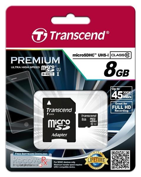 TRANSCEND MicroSDHC karta 8GB Premium, Class 10 UHS-I 300x + adaptér
