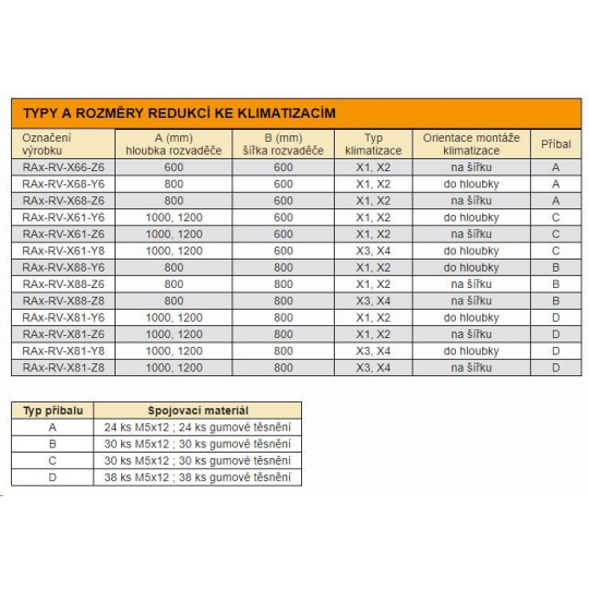 Abychom využili plně potenciál klimatizačních jednotek nasměrováním chladícího vzduchu přesně podle potřeb instalovaných technologií, dodáváme pro jejich montáž na stojanové rozvaděče řady RDE a RIE instalační redukce. Jedná se o kovový panel, který se šroubuje na velkoformátový otvor v horním dílu rozvaděče a na který se umístí klimatizace. Redukce jsou symetrické, takže změna orientace proudění vzduchu je možná otočením redukce. Různé velikosti redukcí a orientace otvorů pro chladící vzduch jsou v tabulce na této straně. Pro snadný přístup k ovládacímu panelu termostatu je ho možno namontovat ve 2 pozicích pouhým zasunutím do konektoru (viz. instalační manuál).