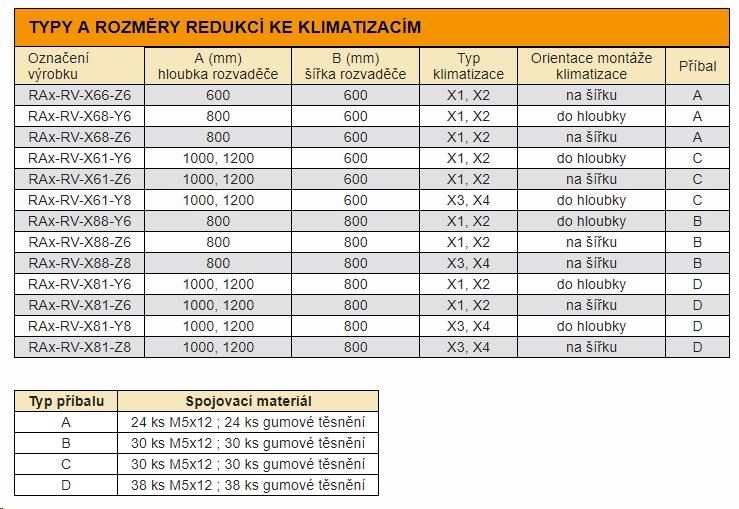 Abychom využili plně potenciál klimatizačních jednotek nasměrováním chladícího vzduchu přesně podle potřeb instalovaných technologií, dodáváme pro jejich montáž na stojanové rozvaděče řady RDE a RIE instalační redukce. Jedná se o kovový panel, který se šroubuje na velkoformátový otvor v horním dílu rozvaděče a na který se umístí klimatizace. Redukce jsou symetrické, takže změna orientace proudění vzduchu je možná otočením redukce. Různé velikosti redukcí a orientace otvorů pro chladící vzduch jsou v tabulce na této straně. Pro snadný přístup k ovládacímu panelu termostatu je ho možno namontovat ve 2 pozicích pouhým zasunutím do konektoru (viz. instalační manuál).