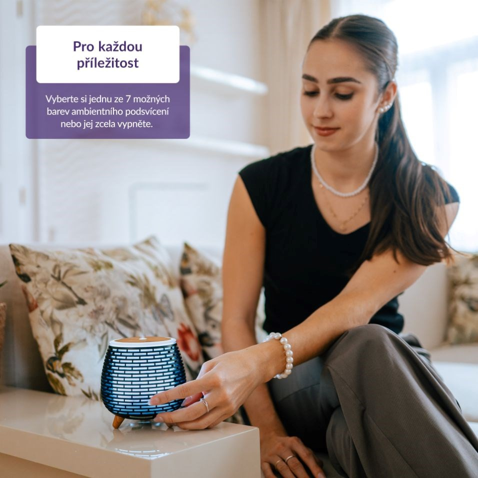 Aromaterapeutická funkce difuzéru přináší mnoho benefitů pro tělo i mysl a velmi pozitivní účinky má i jako zvlhčovač vzduchu. Naplňte jej pouze vodou a pára zvlhčí místnost na optimální hodnotu, aby se vám lépe dýchalo. Zvlhčený vzduch pomáhá i při potížích s astmatem, suchou pokožkou a ekzémy. Když voda klesne pod minimální hranici, difuzér se automaticky vypne, takže ho bez obav můžete nechat puštěný i během spánku.