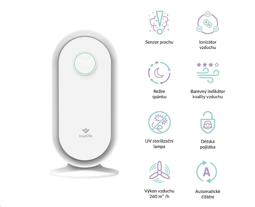 Čistička vzduchu TrueLife vyčistí až 260 m3 vzduchu za hodinu. Je vhodná do místnosti o velikosti 25-30 m2 a díky nízké hmotnosti jí můžete bez obav přenášet. Čistička celkově zlepšuje kvalitu vzduchu, ničí viry, bakterie a další nečistoty a může tak významně pomoci alergikům nebo astmatikům. Čistička je opatřena barevnými indikátory kvality vzduchu, funkcí automatické detekce nečistot a automatického čištění. Bydlíte-li na místě, kde se často práší, potěší vás přítomnost prachového senzoru. 6 násobná filtrace v podobě anti-bakteriálního filtru, HEPA filtru, uhlíkového filtru, katalytického filtru, UV světla a ionizace zachytí až 99,9% polétavého prachu a vyčistí 93,5 % těkavých organických látek. Zároveň zachycuje i viry a koronaviry.