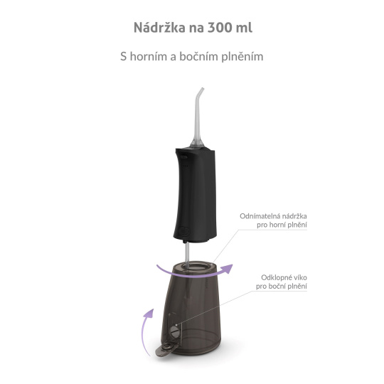 Nádržka o objemu 300 ml vystačí na vyčištění celého chrupu a zároveň je dostatečně kompaktní. Kromě obyčejné vody jí můžete naplnit ústní vodou pro extra svěžest.