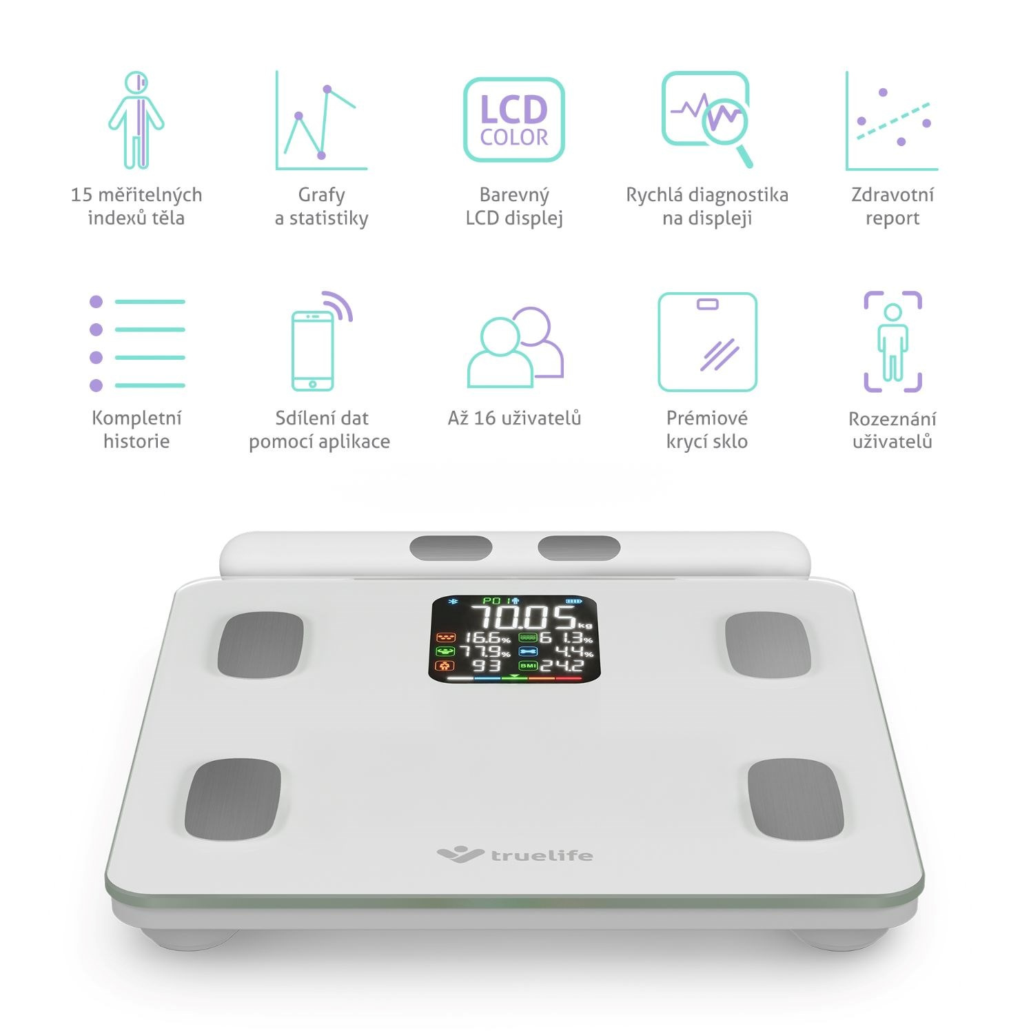 TrueLife FitScale W8 BT White pomocí Bluetooth snadno propojíte s aplikací, která je kompletně v češtině, přináší řadu výhod a rozšiřuje možnosti osobní váhy. Během vážení se údaje automaticky s aplikací synchronizují, a to až pro 16 uživatelů. Přehledný report pak nabízí 15 indexů těla s detailním vysvětlením a doporučením týkajícím se stravy a cvičení, jak postupovat k vytyčenému cíli. Z 15 posledních měření vytvoří aplikace i grafy a statistiky, aby byl vývoj zřetelnější. Data lze synchronizovat také s aplikacemi Moving life, Apple Health, Google Fit a Fitbit.
