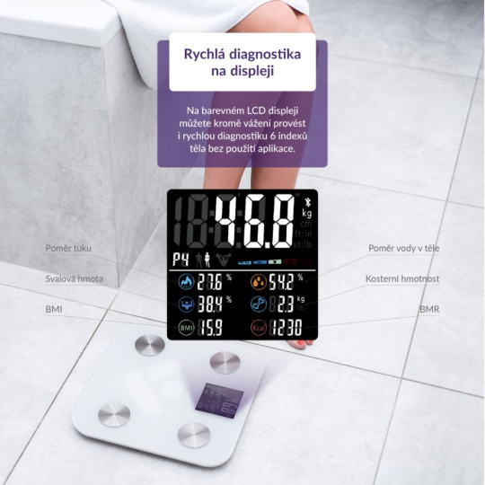 Pro rychlé zhodnocení kondice těla vystačíte s displejem váhy, kde vidíte 7 tělesných indexů i bez aplikace.