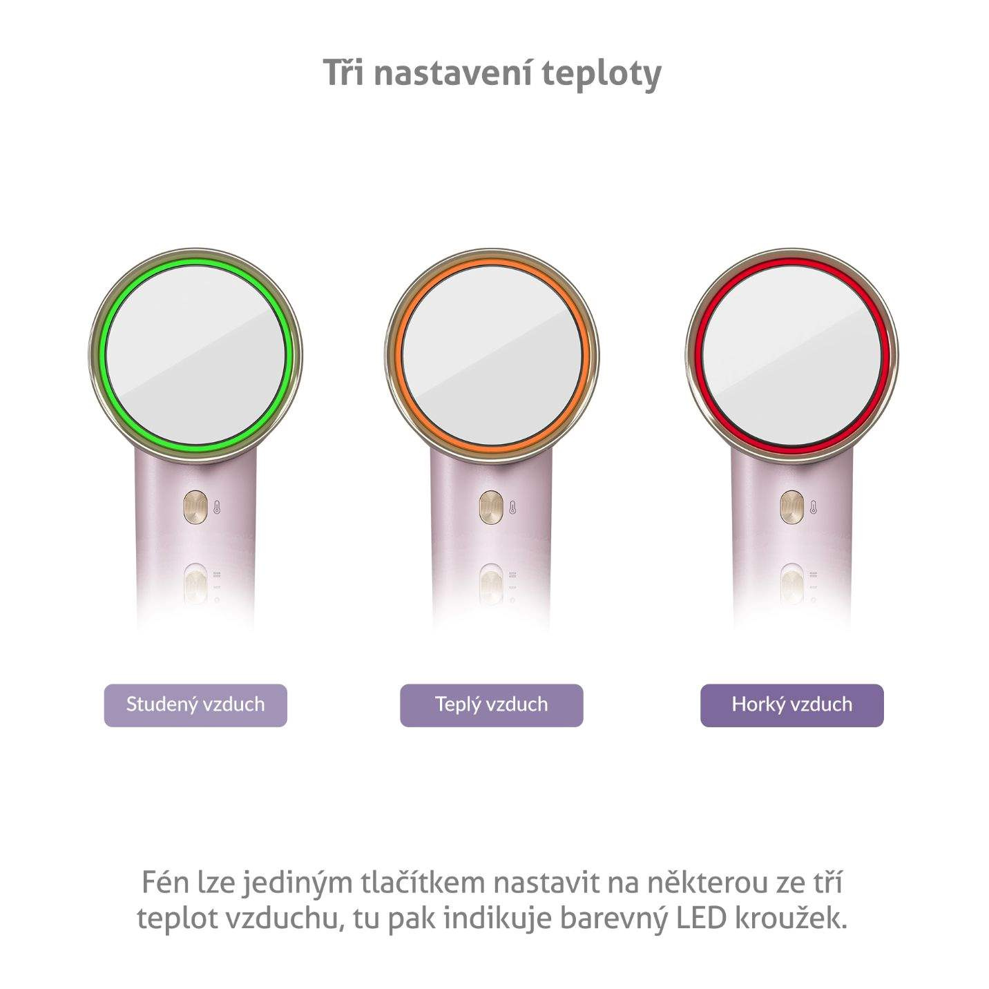 Pomocí jediného tlačítka si jednoduše navolíte, jakou teplotou chcete vlasy vysoušet. Zvolit lze mezi vzduchem studeným, teplým, horkým a módem střídání studeného a horkého vzduchu. U rychlosti vysoušení máte na výběr mezi vysokou a normální.