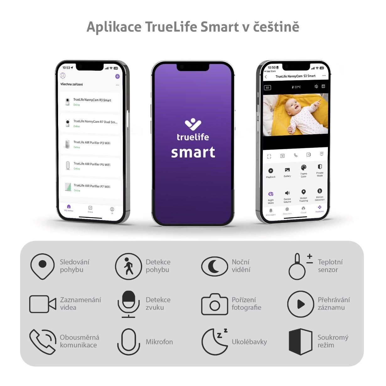 Ovládejte chůvičku snadno a pohodlně v aplikaci TrueLife Smart, která je kompletně v češtině, a je dostupná jak pro iOS, tak i Android. Navíc ji můžete sdílet s dalšími členy rodiny, aby měl přehled každý, kdo má být nablízku.
