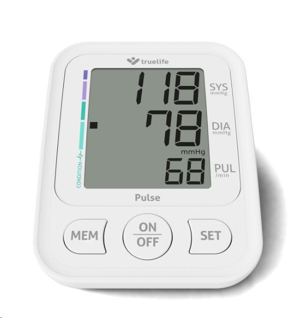 Tlakoměr Truelife Pulse využívá oscilometrickou metodu měření tlaku a funguje na principu nafouknutí manžety, která zajišťuje maximální přesnost naměřených hodnot. Navíc jeho ovládání je velmi jednoduché a vše podstatné zvládnete stiskem tlačítka START/STOP. Naměřené hodnoty zobrazuje velký a dobře čitelný třířádkový displej.